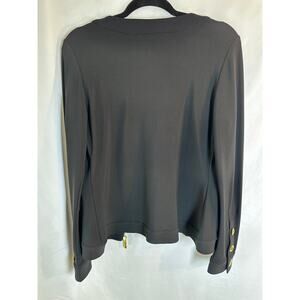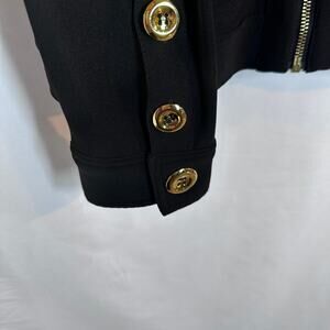 Bougie Chic and structured, this Boston Proper black jacket/ sweater is a versatile wardrobe staple. Features a full front zip closure, gold-tone zipper chest pockets, and decorative gold buttons on flap pockets and cuffs. Made of a stretchy nylon/spandex blend for comfort and a flattering fit. Collarless, lightweight, and easy to dress up or down.