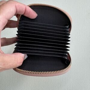 This is a new wallet. It’s soft, and has a ton of compartments inside. 4 inches wide by approximately 3 inches tall.