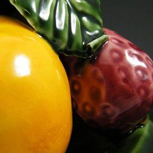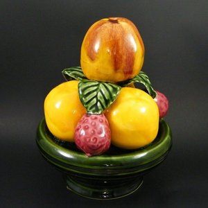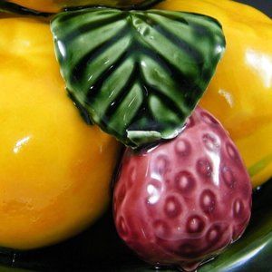 Ceramic Bowl of Fruit Centerpiece By Jay Willfred - Apple, & Strawberries Made in Portugal Very Good Condition No Chip Or cracks. A little bit of leaf curl over due to manufacture defect perhaps cooking too long in the oven. Check pictures above! This piece is beautiful.