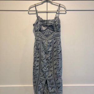 Self & Trim: 100% poly.Lining: 95% poly, 5% elastane. Hand wash cold. Fully lined. Adjustable shoulder straps. Allover lace fabric. Back cut-out with 3 button closures. Hidden back zipper closure. Revolve Style No. BARD-WD153. Manufacturer Style No. 37969DB.