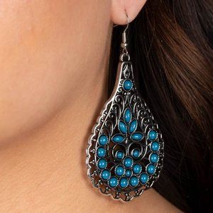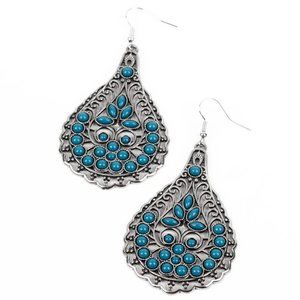 An elongated silver teardrop is filled with leafy filigree and adorned with marquise-cut and round Midnight beads, creating a vibrant and whimsical display. Earring attaches to a standard fishhook fitting.