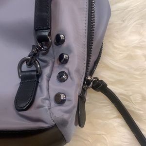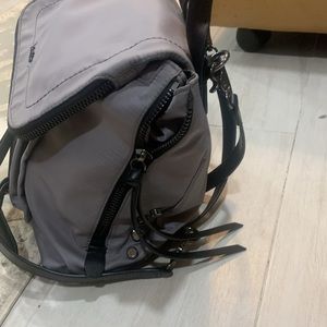 Backpack with adjustable sides that expands for more room, adjustable leather straps , top handle with leather trim, loads of pockets, metal stuffs on each side, perfect for work or school,