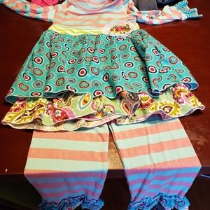 Pants have matching ruffles, Top has different patterns with 2 layers underneath. Sleeves have ruffles. Outfit was a handmade Botique set