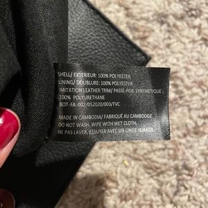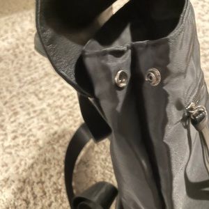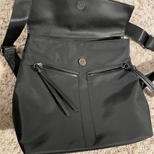 All black, pocket inside, adjustable straps, two small zipper pockets in front, leather detailing