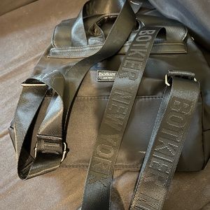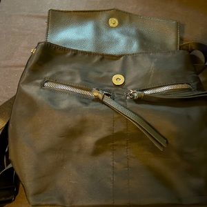 Small, black Backpack. Does have quite a bit of space in it. Never used but I did take the tags off. Two small outer pockets.