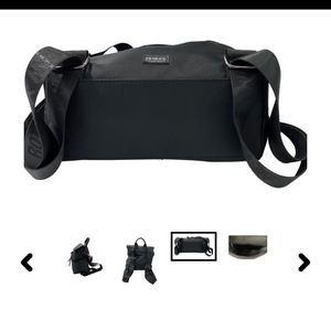 Black nylon and leather backpack with exterior zip pockets. Backpack straps have BOTKIER NEW YORK text on them. Small top handle. Top snap closure. Black fabric lining with zipper interior pocket. 9" H x 9" W x 4" D.