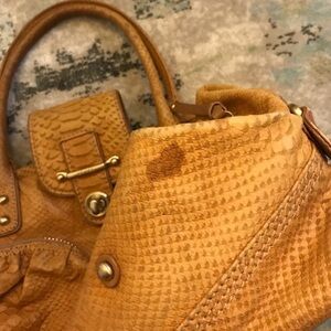 Bianca bag from BOTKIER in Python. 100% leather and in good used condition. Clasp and zip closure, 2 exterior pockets, internal zip pocket and 4 open pockets. Minor wear to leather (photographed) and light wear on inside but mostly clean. Handles in excellent condition. Super rare color, very well made bag. Comes with authenticity card