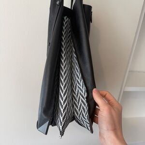 Sleek and functional Botkier Tote that expands as needed! Very sleek without items, but expands to meet your needs while running errands. Metal tipped corners for durability.