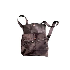 Adjustable straps / snap closure/ one inside pocket / two outside pockets/ clean inside / length 10” / height 10” / width 4”