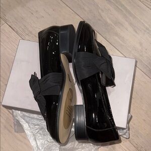 Elegant black patent loafers. Features a bold bow accent. Perfect for a sophisticated style.