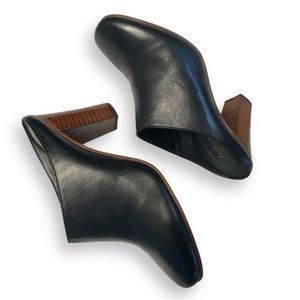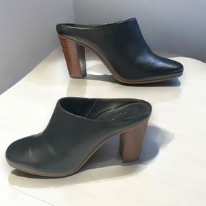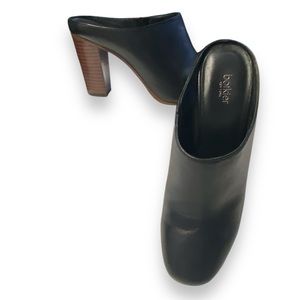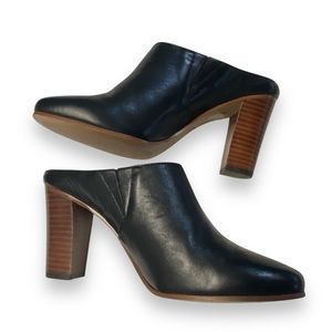 Classic clean lines on these sharp black leather mules by Botkier. 3.5 inch heels. Non-slip soles.