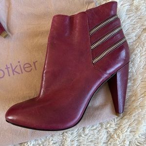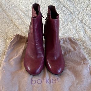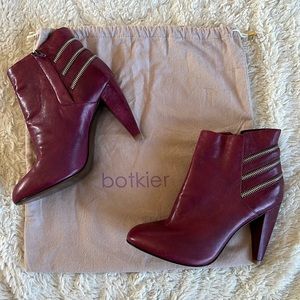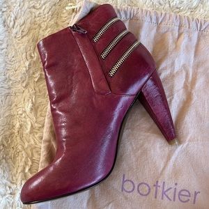 Botkier Booties in a lush, plum wine hue with striking zipper detailing. Seriously fabulous, and just dying to be taken for a strut! Dust bag included. Botkier size chart converts the Euro sizing to a USA size 9, but I’m a true 9, and these were too snug for me. Would fit an 8 better!