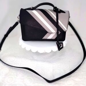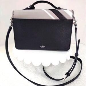 Excellent Condition! Botkier Cobble Hill Leather Crossbody Purse. Dual Compartments. Colors: Black/Light Grey/White (funky stripes). Flap Closure with Hidden Magnets. Front Slip Pocket. Back Zip Pocket. Silver Hardware. Botkier Hangtag. **Extra Detachable/Adjustable Two Tone Web Strap**and Extra Zipper Pull** 8" Wide 6.5" High 2.5" Deep 20-23" Strap Drop No Flaws. No Problems!