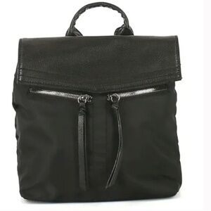 This Botkier backpack showcases a sleek black color and a durable matte fabric construction. Its rectangular shape with rounded edges offers a modern look, while the flap-over top with dual zippers adds both style and functionality.