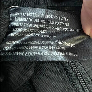 — Material: 100% polyester with 100% polyurethane trim; lining 100% polyester