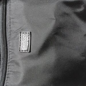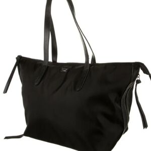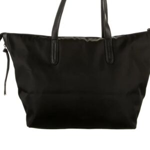 this is a really fantastic boquilla nylon tote made New York. it's black it's made from nylon. So I love that because it's washable it has to nail Hardware and it also has leather trim Embellishments flat handles it has a canvas lining and 3 interior Pockets one with a zipper. it has a zip closure at top. It has two side zippers with tassels for decoration only. it's perfect to go with any outfit you are wearing it's a designer bag but it also has the ability to hold a lot of things that you might need and it is washable if needed. The measurements are the height is 11.5 inches with 19in depth 8 inches the shoulder strap drop is 9.5 in it is in pristine condition it retails for $125 really great bag
