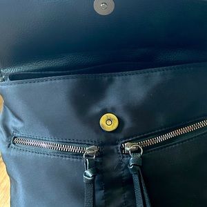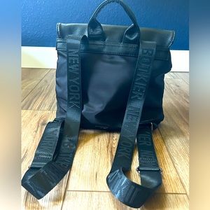 Cute and functional Botkier mini backpack. Nylon and faux leather featuring thick adjustable straps, two small zipper pockets on the front and one zipper pocket inside. The bag is about 10in by 11in. New without tags.