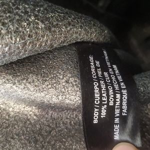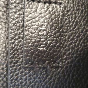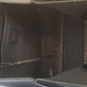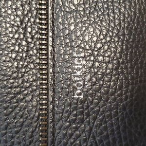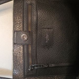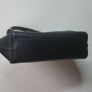 Black pebbled leather. Gunmetal hardware/zipper detail. Magnetic snap closure. Duel top handle. Unlined. Interior zip and slip pockets. Clean inside and out. Like new with no signs of use.