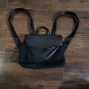 Botkier New York Mini Trigger Backpack in black made of nylon and faux leather, magnetic closure, adjustable strap, two exterior zipper pockets and one inter zipper pocket. and strap logo accents. Like new