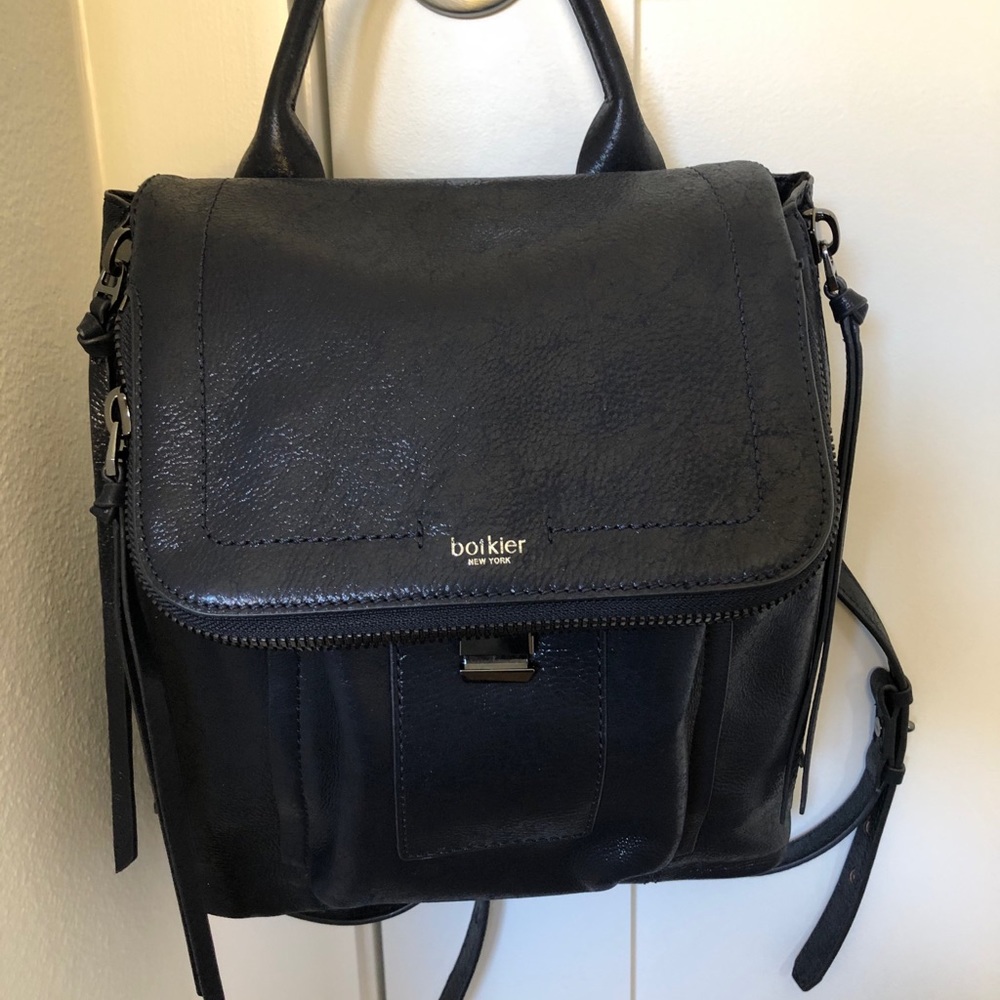 Navy leather Botkier backpack. Drawstring top. Flap is also a zippered pocket with another front pocket inside flap. Brand née, never used.