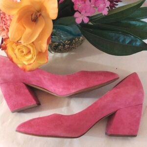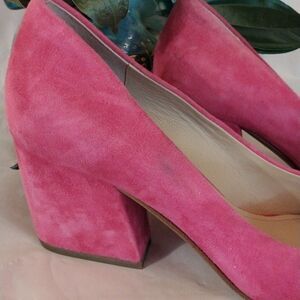 Style: Stella. Luscious pink suede heels. Pointy toes. Padded footbed. Chunky heels. Light marks on heel, a blush, and right shoe outside , see photos. Size 7.5 measures 3.25 wide, 10.75 long to end of pointy toe. 2.5 inch heel. Very good condition. So very pretty.