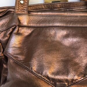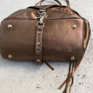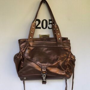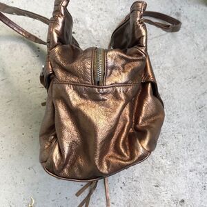 This is a bronzy color bag that is not new and has slight fading so please look at the pictures. Inside is clean. Measuring across the bottom is 11 inches add another 2 inches for the side pocket. Top to bottom Kayden shoes by 6.5 inches handle drop is 8.5.