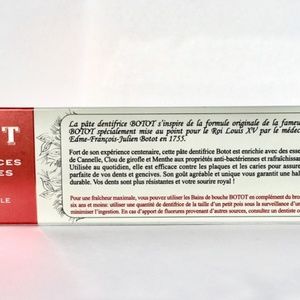 The World's First Toothpaste. Invented in 1755 by Dr. Julien Botot for King LouisXV of France. With a natural gillyflower (clove family) base, this paste andmouthwash warm the gum line first then cleanse. It is recognized by The Royal Society of Medicine as a Superior Natural Product. Original French Formula. This toothpaste has a fantastic Ginger & Anise flavor! Anti-Plaque Anti-Bacterial Cleansesand freshens breath Direction: Regular brushing of teeth. Ingredients: Calcium Carbona..