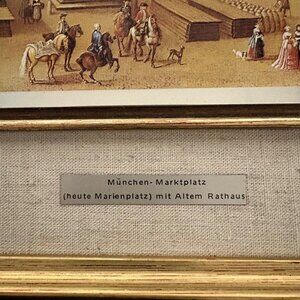 This framed lithograph art piece showcases a detailed depiction of Munich Marketplace, complete with a professional finish and gold accents. Ideal for refined interiors.