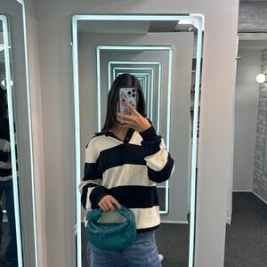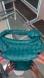 Teal leather intrecciato weave, gold-tone hardware, flat handle with knotted detail, leather lining, zip top closure