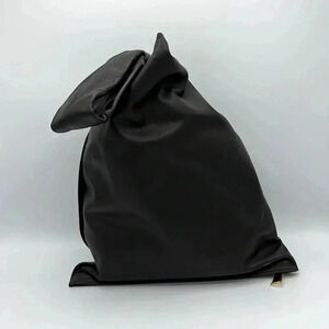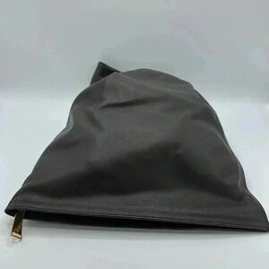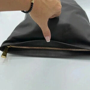 New never been used. In a beautiful dark chocolate brown all leather. Easy to use top knotted handle with bottom zipper with gold hardware.