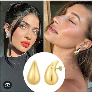 Authentic Bottega Veneta Small Drop Earrings in gold. Celebrity favorite as seen on Kylie Jenner, Hailey Bieber and more!