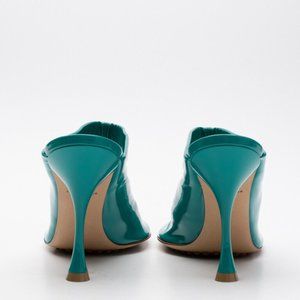Bottega Veneta EU38 US8 Supergloss Leather Mule Heel Shoe Turquoise Dot Sock