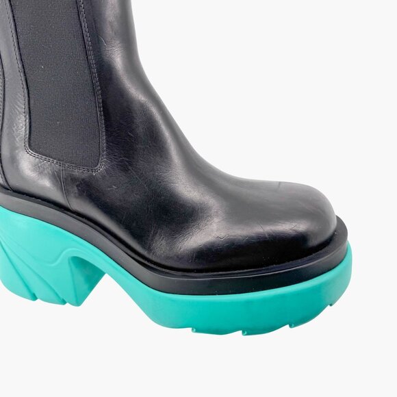 Bottega Veneta Flash Chelsea Ankle Boots EU 38 US 8 Black Leather Teal Heel Tire