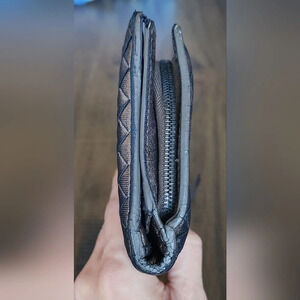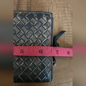 Bottega Veneta is an Italian design house known for supreme quality and hand-woven leather goods. With the famous 'intrecciato' weave, they portray a clean and classic style that is always recognizable, but never overtly branded. Black/Silver metallic leather. Exterior in good condition, one corner shows slight wear, inside leather shows wear, no rips, stains, or tears. Comes with dust bag and box. Add a chain for the perfect wallet on a chain purse.