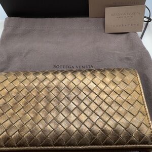 This Bottega Veneta beautiful gold weave Intrecciato wallet is gorgeous!! Pre owned but in beautiful condition. Comes with box tags and dust bag!!