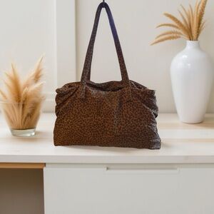 Stylish leopard print tote bag perfect for any occasion. Add a touch of wild elegance to your outfit. Bag is in good condition with some discoloration and wear on bottom edges but interior is very clean.