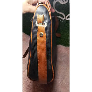 Material: Black coated canvas body with textured brown leather trim and strap. The leather has a cross-hatch (almost saffiano-like) texture.