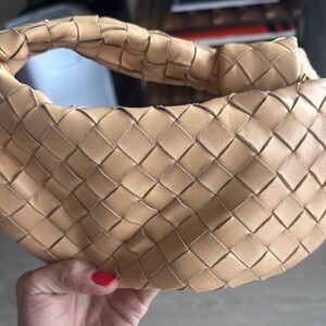 Elegant nude Bottega woven leather clutch bag, perfect for any occasion. Stylish and versatile.