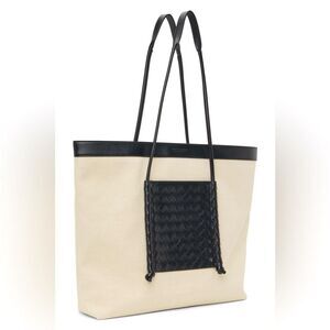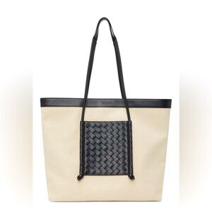 Bottega Veneta Off-White Canvas with Leather handles, trim, and 2 outside intrecciato pockets. NWT. Only unpackaged for pictures -PRISTINE. Canvas and intrecciato-woven buffed calfskin tote in off-white and black. Logo embossed at face Fixed carry handles. Patch pocket at face and back face. Magnetic closure. Zip pocket and patch pocket at interior. Keyring at interior. Canvas lining. H15 x W19 x D4. Supplier color: Natural/Black