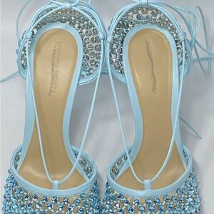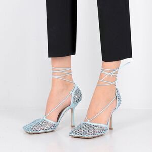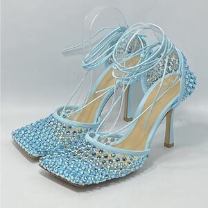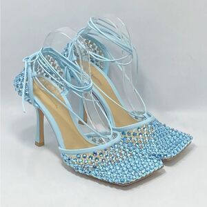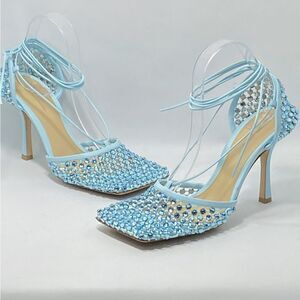 Nets of sky-blue crystals sparkle at the angled toe and counter of an ankle-wrap pump that offers a fresh, airy take on glamour.