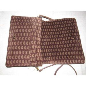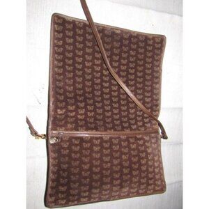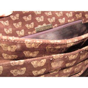 The bag has a brown suede, hard framed style body with embossed pinkish butterflies throughout. It has a long, removable brown leather shoulder strap and a rectangular shape with an envelope style snap top closure. The purse is so unique and in beautiful condition!