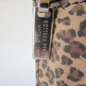 Bottega Veneta Wallet. 100% authentic( please see photo showing Certificato Di Originalita) Dimensions: 7.5" length, 4.5" height. Snap closure. Leather carry handle. Zippered coin compartment. 2 large main bill compartments. Outside zipper pocket. Leopard print fabric with soft, supple calf leather interior and trim. Carry it as a clutch with carry handlePreowned. Good condition, please see photos. Outside zipper pocket has some slight clamminess.