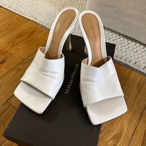 Step out in style with these elegant white heeled sandals from Bottega Veneta. Perfect for any occasion, these shoes offer both comfort and sophistication.