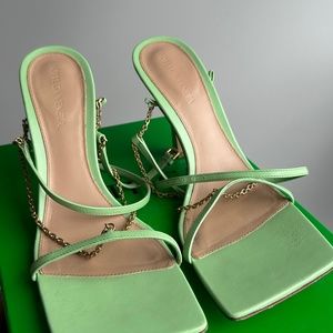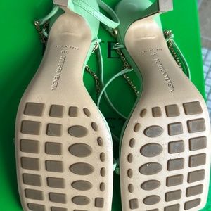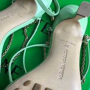 This is an authentic pair of BOTTEGA VENETA Lambskin Stretch Chain Strap 90mm Sandals size 39 in Pistachio. These stylish sandals are crafted of smooth leather and feature a squared toe, and a 4-inch heel.
