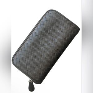 EUC Elegant woven zip-around leather wallet in brown. Made in Italy. An intrecciato, a hand-woven leather technique and brand's signature woven pattern. Interior configuration includes card slots, bill compartment, and coin pocket. Perfect for everyday use.