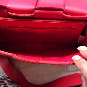 Chic red crossbody with signature woven design. Perfect for versatile styling. Elegant and functional.