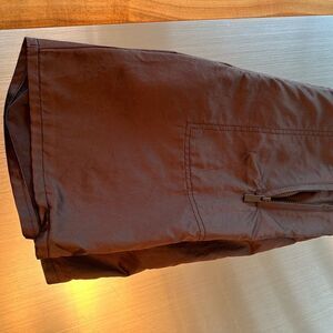 Bottega Veneta brown techno fabric Bermuda shorts with zipper pocket detail. Size 44. They fit like a size 10. There is a side, zipper and snap closure on the side of the shorts. They are super flattering and comfortable. Perfect condition. Measures 32 inches, the length is 36 inches, and the hips measure 36 inches.