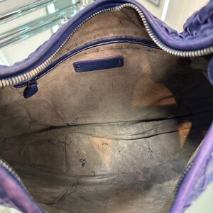 Purple leather, intrecciato weave, single shoulder strap, zip top closure, suede lining, single interior zip pocket