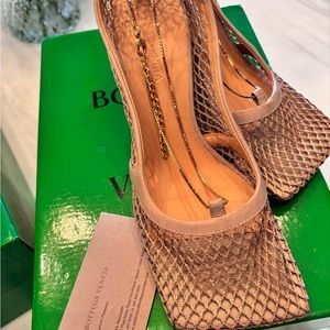 Bottega Veneta size 36/6 heels with gold chain in a nice tan color . Authentic