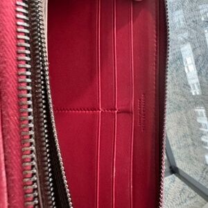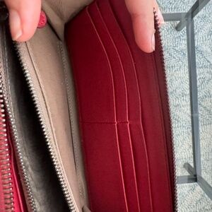 Red lamb leather zip around wallet 5 bill compartments 8 card slots Coin pocket with zipper.